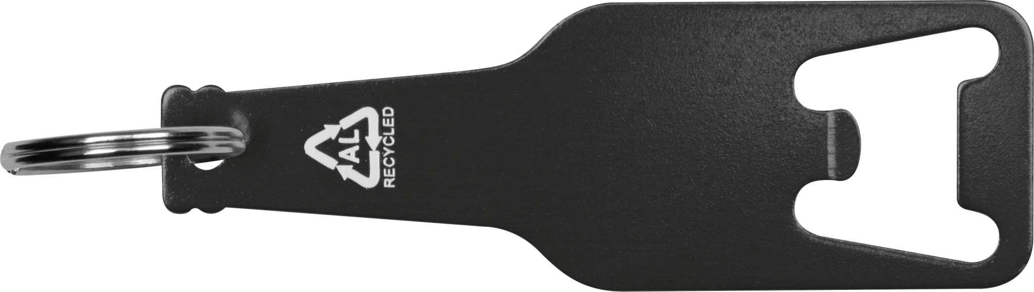 Flasköppnare av återvunnet aluminium inklusive nyckelring. Vi lasergraverar din logotyp på hänget.