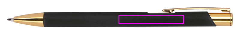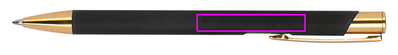 Kulpenna gjord av aluminium med guldapplikationer, gummifinish och blå skrivpåfyllning med stor kapacitet. Din logotyp kommer att laseras på höger sida av klippet, den kommer att visas i guldfärg.