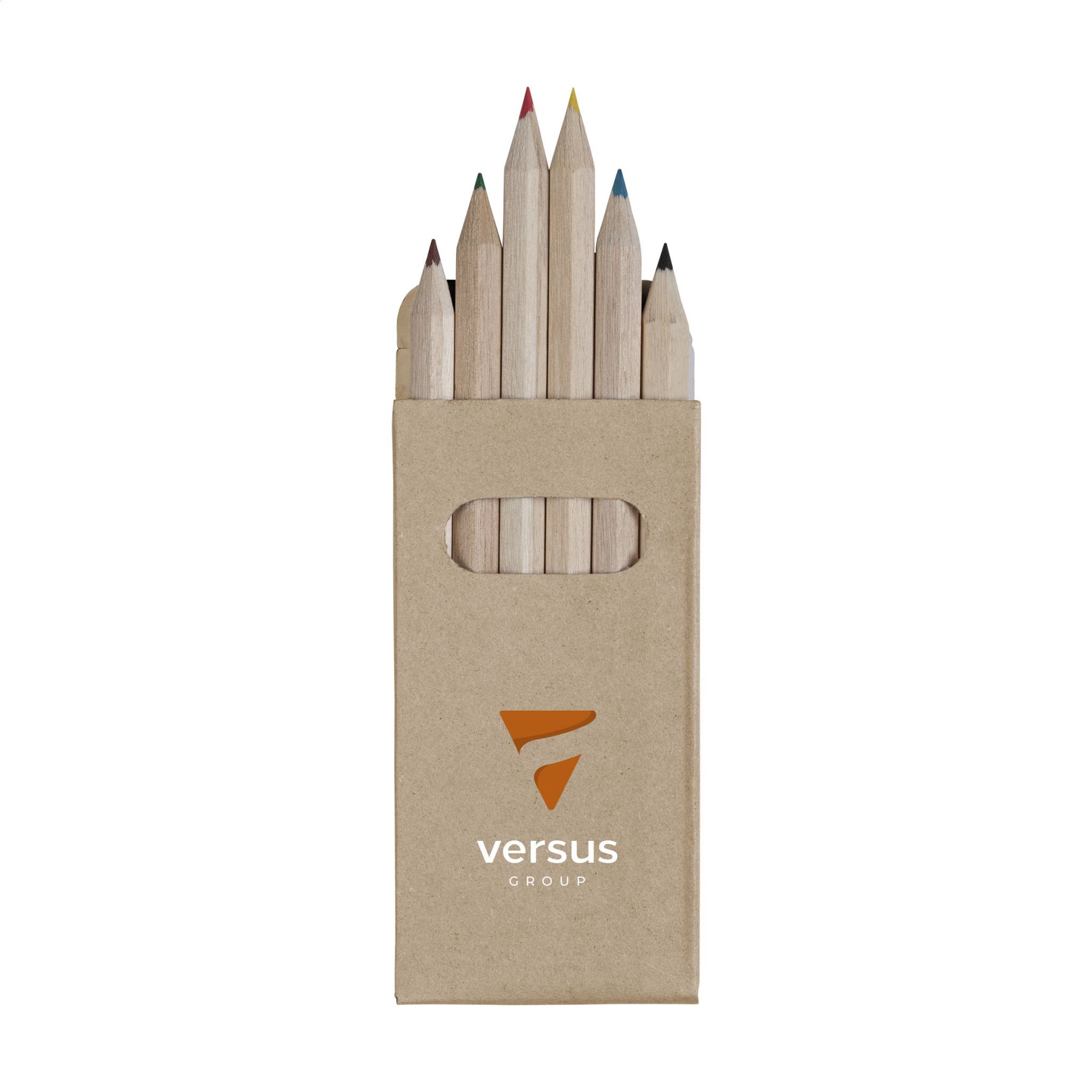 6 omålade färgpennor i trä i en återvunnen kartong.