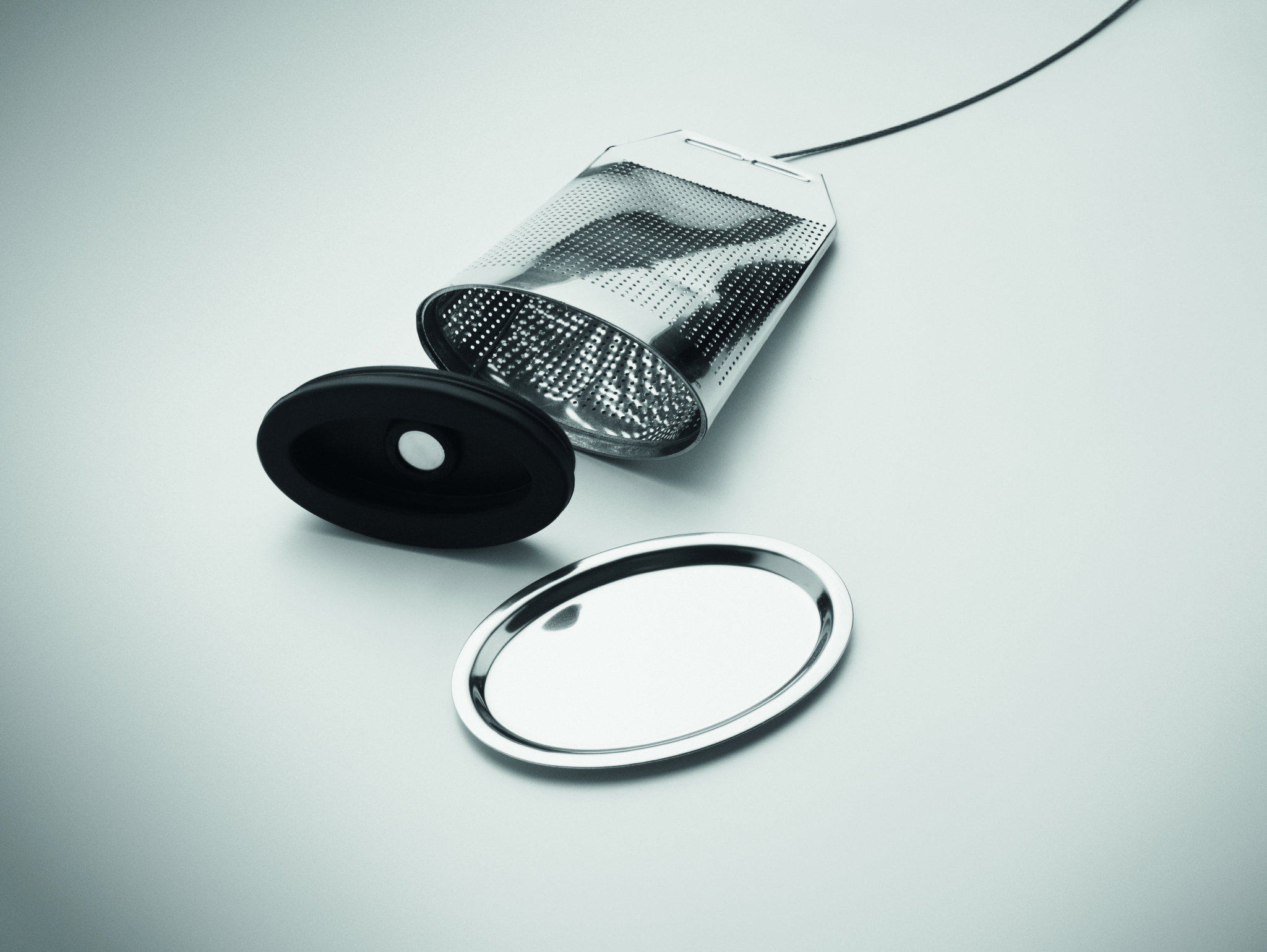 Tesil i rostfritt stål i tepåseform med tallrik. Stor tesil med silikonhandtag.