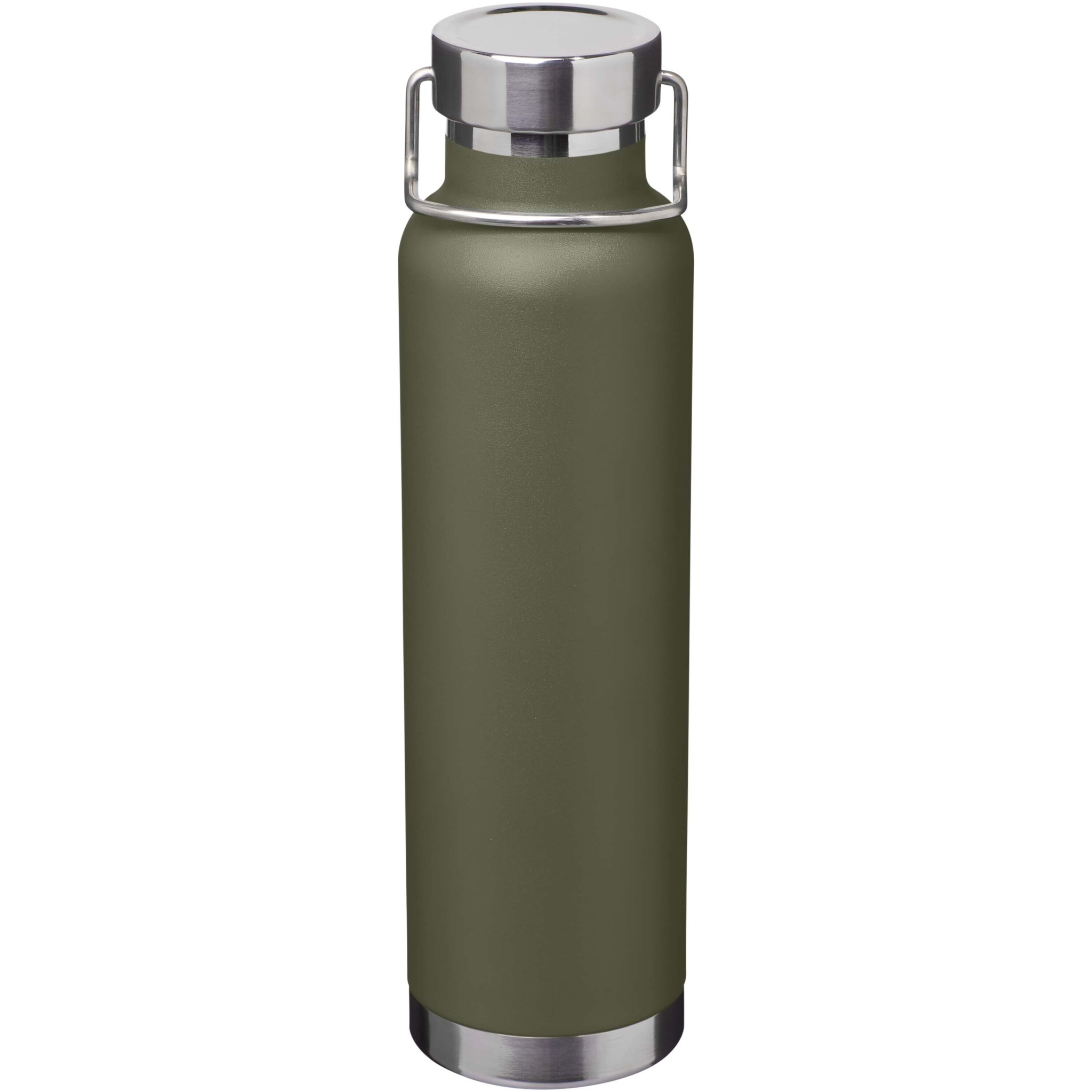 RCS-certifierad, dubbelväggig flaska av återvunnet rostfritt stål med vakuumisolering av koppar. Har ett skruvlock av återvunnet rostfritt stål med en hållbar handögla i rostfritt stål. Bred öppning för bekväm påfyllning och hällning. Volymkapacitet: 650 ml. Levereras i en presentförpackning.