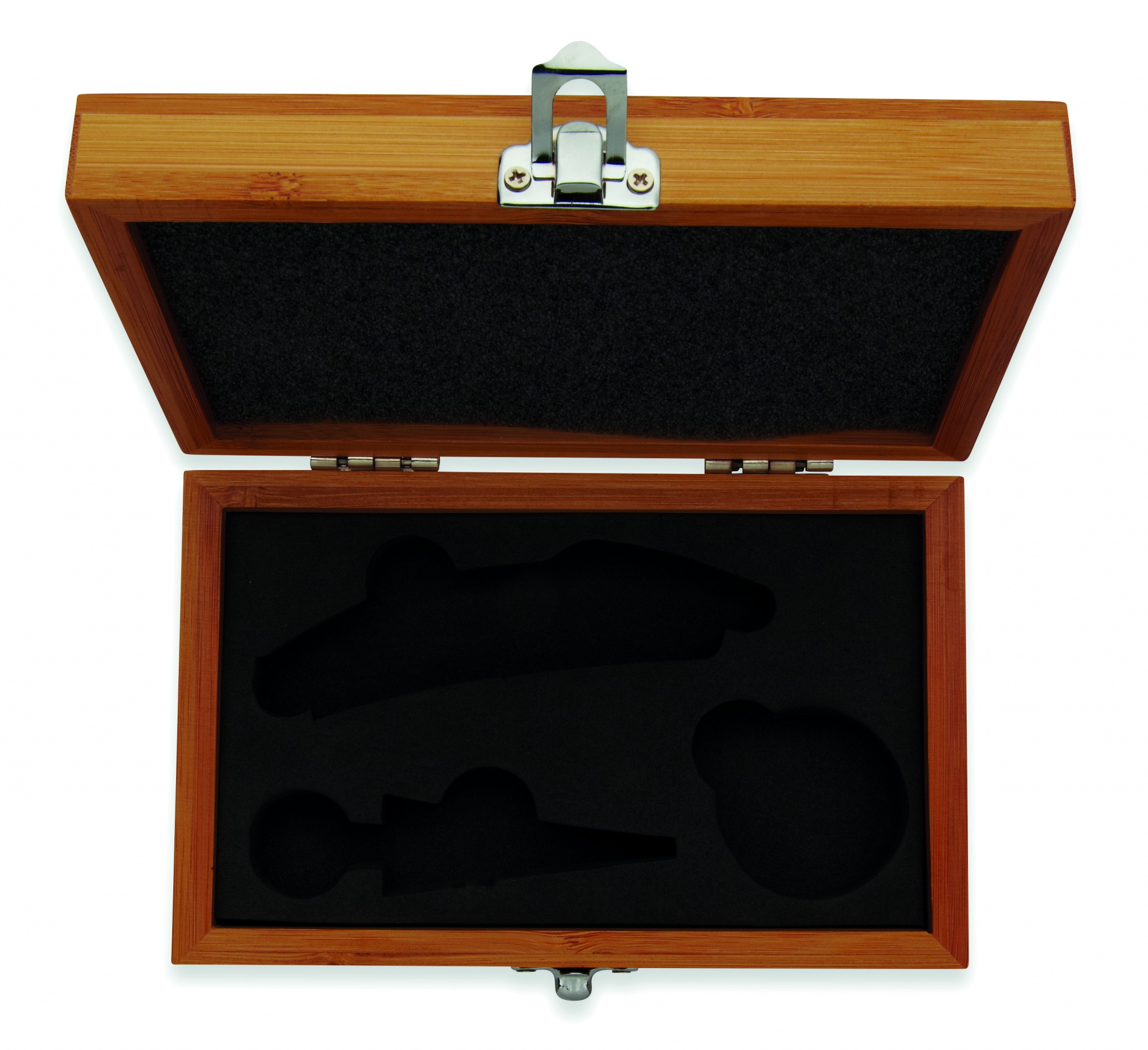 Vin set i bambu lådan innehåller en korkskruv, vin krage och propp i rostfritt stål .